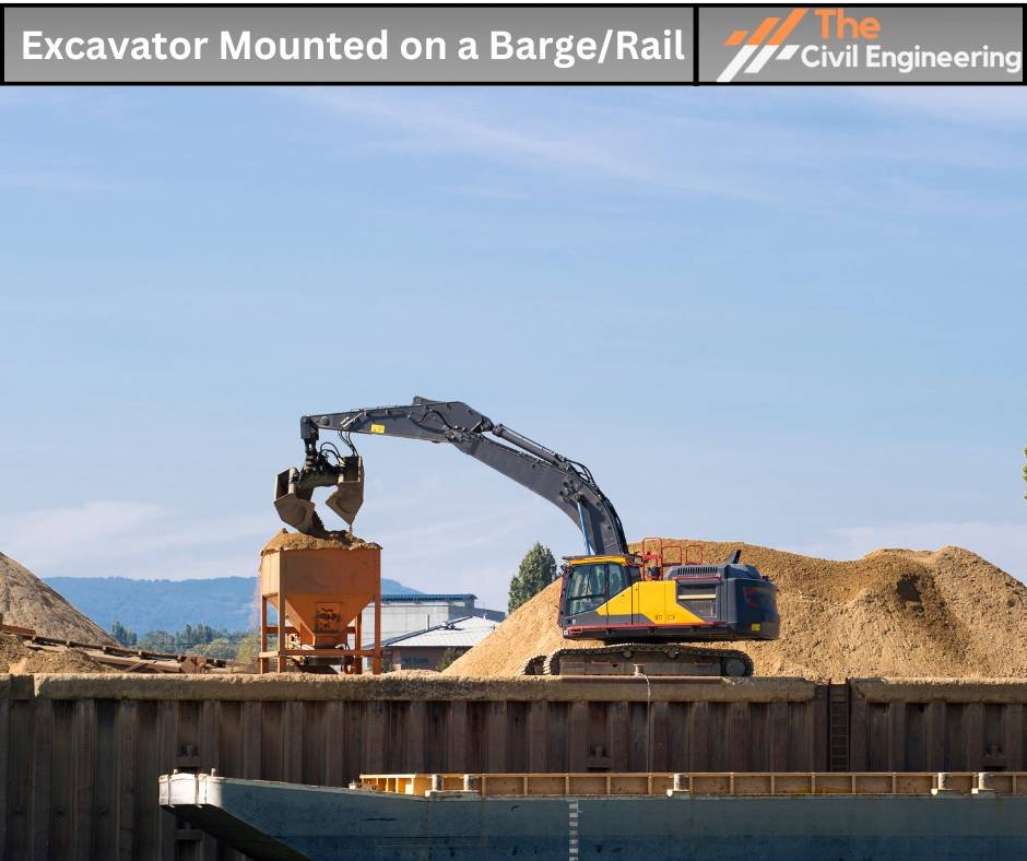✔ The type of excavators used in railway lines or water are mounted on a barge.